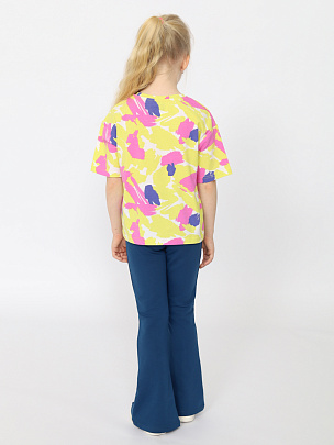 Трикотажная футболка оверсайз для девочки, выполненная из мягкого набивного трикотажа. Свободный силуэт с заниженной линией плеча не сковывает движения. Модель дополнена круглым вырезом горловины и короткими рукавами.