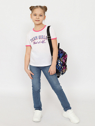 Футболка для девочки с трендовым колледж-принтом, с блестящим эффектом и контрастными бейками по горловине и рукавам. Модель сделана из 100%-хлопкового трикотажа. Материал приятно прилегает к телу, не сковывает движения и позволяет коже дышать.
