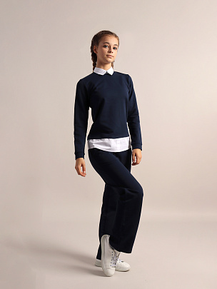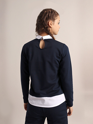 Джемпер с длинными рукавами из футера. Горловина круглая, обработана отложным воротником из сорочечной ткани. На спинке обработана застежка "капелька" на пуговичку. Рукава с манжетами по низу. Нижние срезы переда и спинки обработаны притачными деталями из сорочечной ткани, создающими ощущение двухслойного изделия.