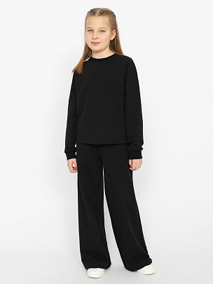 Стильный базовый спортивный костюм в стиле оверсайз (свободный крой) состоит из 2-х предметов: укороченный свитшот и брюки-палаццо с завышенной талией и расклешенные снизу. Костюм детский, для подростков и девушек. Выполнен из футера без начеса. Элементы костюма можно носить как самостоятельные вещи. Укороченный свитшот можно комбинировать с джинсами, брюками, лосинами. Брюки палаццо отлично смотрятся с футболкой, худи,топиком или лонгсливом. Такие костюмы можно носить и с кроссовками, и с гр...