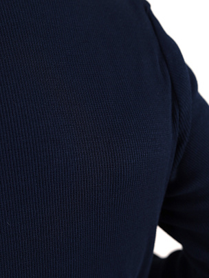 Водолазка с длинным рукавом и высоким воротником-стойка. Манжеты и воротник выполнены из полотна с добавлением эластана.
