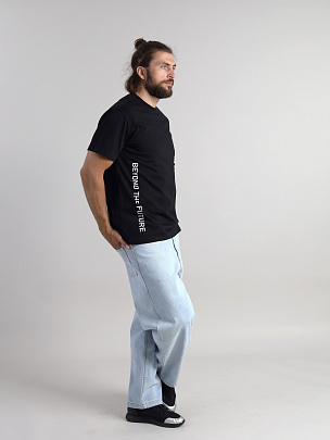 Футболка oversize со спущенным плечом, с коротким рукавом. Горловина круглая, обработана притачной бейкой из рибаны с лакрой. Плечевые швы смещены на перед и отстрочены. По переду вдоль правого бокового шва - текстовый принт.